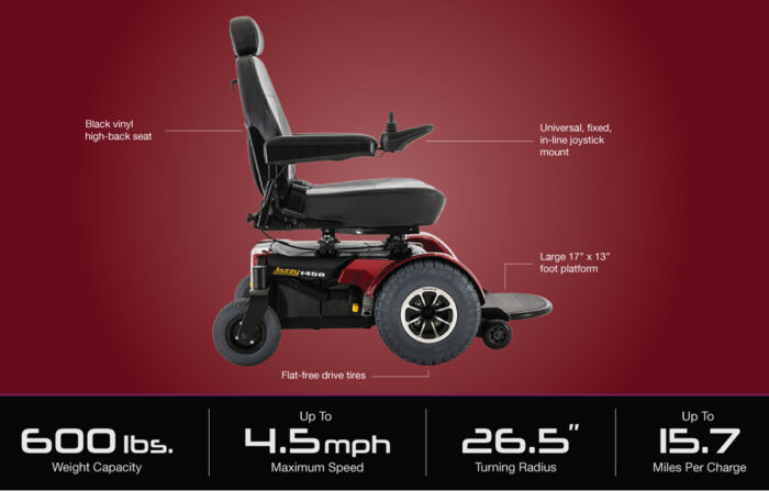 The Jazzy 1450 is a durable and powerful bariatric chair that comes with a 600 pound weight capacity. The chair comes with a sturdy base which is affixed with 14 inch, solid drive wheels and 9 inch rear wheels, which combine to offer maximum traction, support, and stability. You can travel over 12 miles on and single charge at speeds of up to 4 mph!