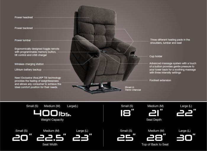 VivaLift! Ultra comes in three sizes: small, medium, and large. In addition to its standard CAPRICCIO fabric in cappuccino, dove, slate, and smoke, it’s now available in SORRENTTO coffee, which is 100% American leather (medium), and TRENTO brown and charcoal (medium and large).